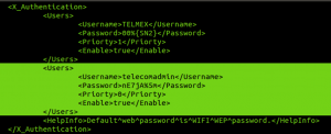 Here is the configuration file of the web authentication portal of the device which contains the backdoor account. You can see that the typical user account "TELMEX" has a password which was automatically generated (same password for WPA) and the backdoor account does not appear on the administration list of the device.