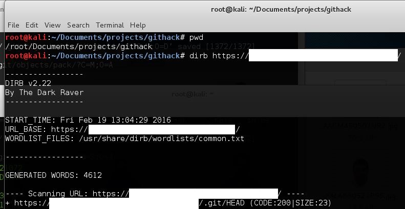 Running this tool on our target website managed to find the folder ".git", which is used by the source code management system that goes by the same name "GIT". The folder has been exposed to the Internet, possibly because it was forgotten about or the web admin never expected anyone to find it.